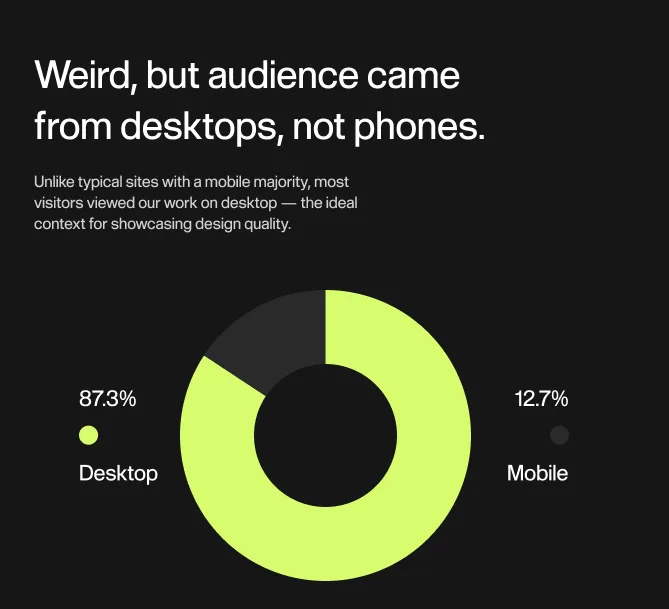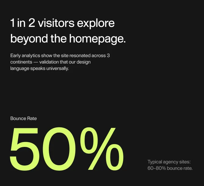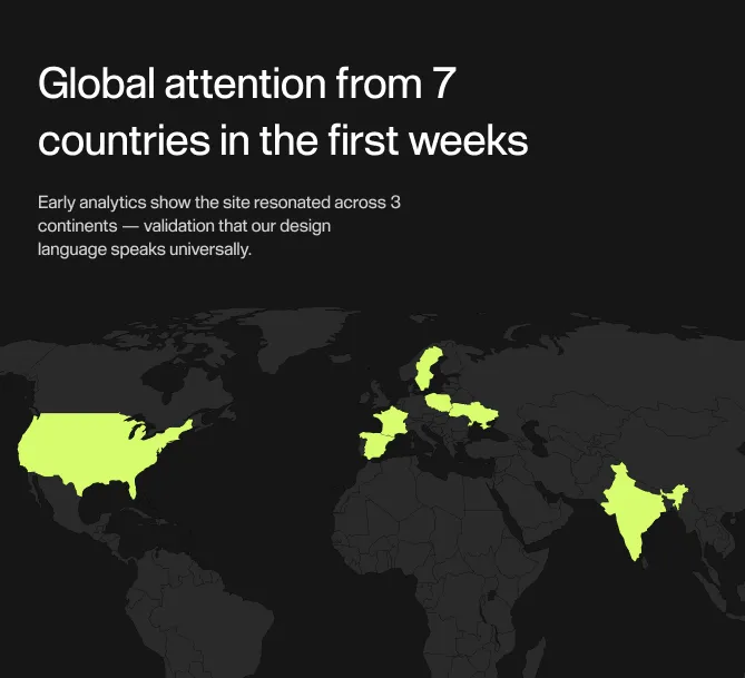 We rebuilt their digital presence around what makes them different: bold typography, confident layouts, and interaction details that reflect precision. The site positions them clearly in a crowded market — not as another studio chasing trends, but as a team with a defined voice and discipline. Recognition came fast: a CSS Site of the Day award and a 35× spike in traffic within 24 hours of launch.